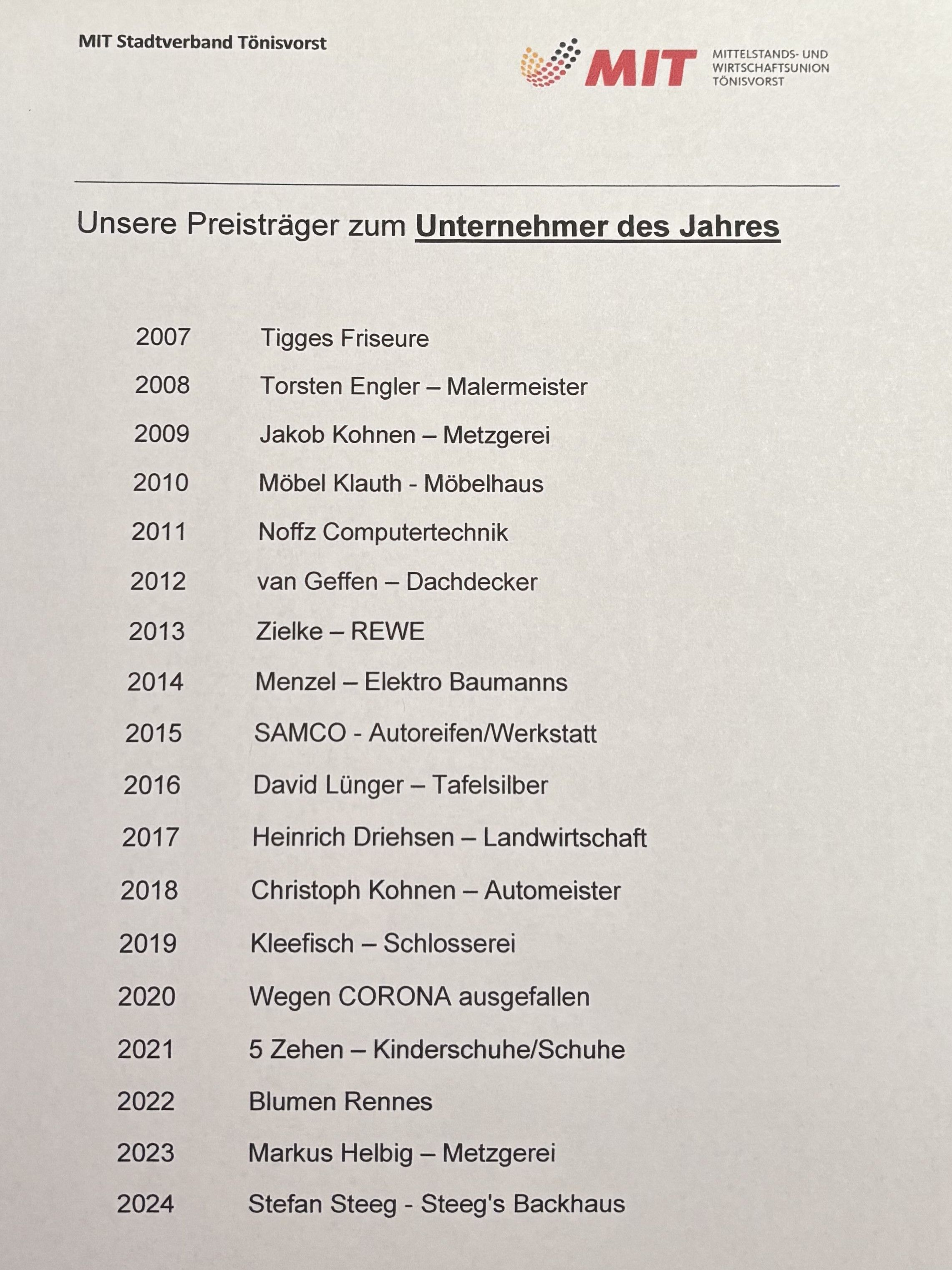 Wirtschaftlich interessierte Bürger bringen bei uns ihre eigene Lebenserfahrung in politische Debatten ein. Wir entwickeln Rahmenbedingungen für Unternehmen und Bürger nach den Grundsätzen der Sozialen Marktwirtschaft. Die MIT unterhält ein unternehmerisches Netzwerk, in dem Ideen auf Kreis-, Landes- oder Bundesebene transportiert werden, und das zahlreiche Events hervorbringt. Über Newsletter und das Mittelstandsmagazin informiert die MIT regelmäßig ihre Mitglieder. In Tönisvorst ehrt die MIT in langer Tradition jährlich den Unternehmer des Jahres, zuletzt die Bäckerei Steeg. Die Liste der bereits geehrten Unternehmer ist lang. In 2024 fand die Ehrung bereits zum 18. Mal statt.
