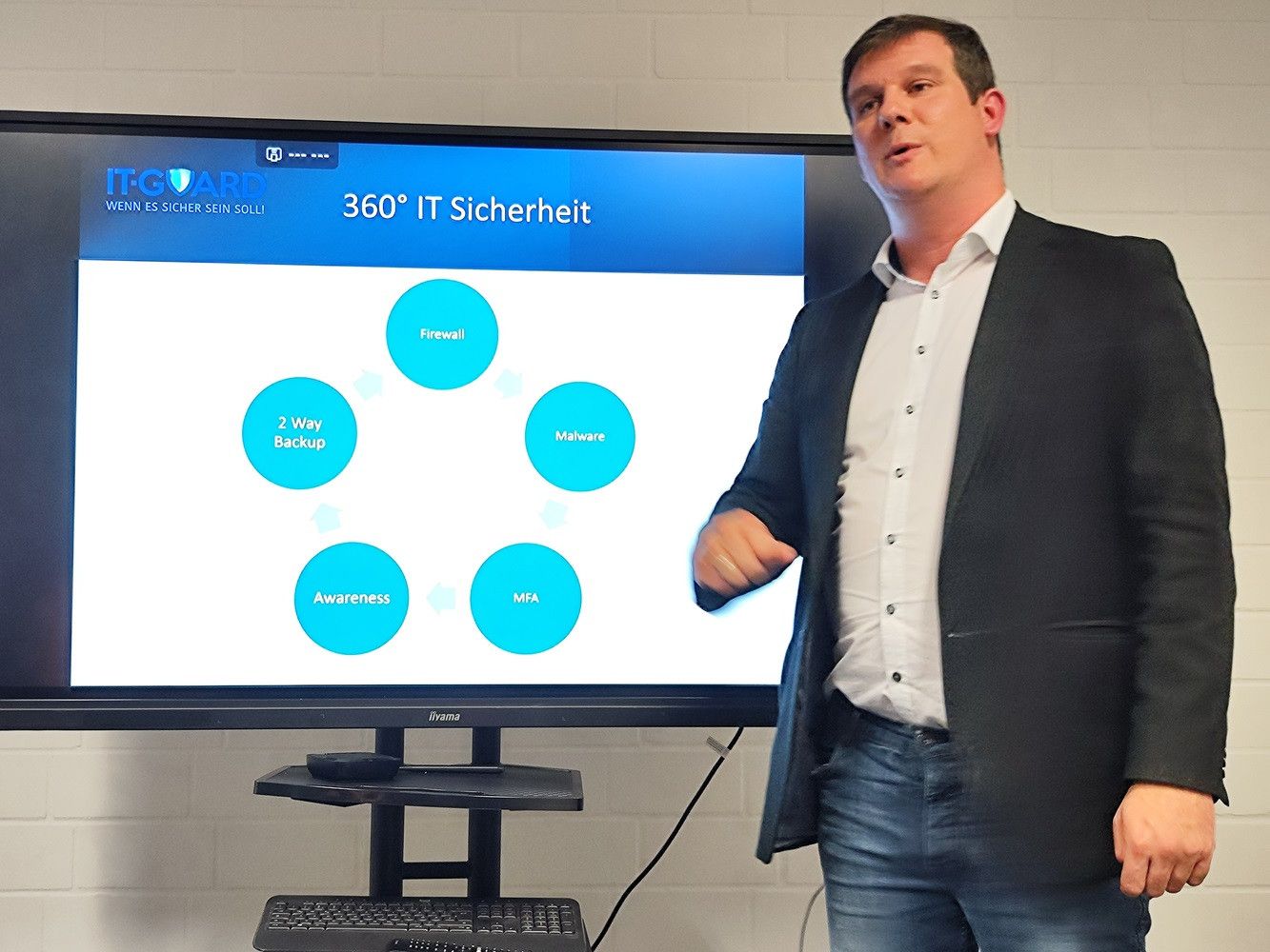 Mit seinem Angebot „Managed 360° IT-Security“ stellte er eine Cybersecurity-Strategie vor, die mittelständische Unternehmen sowohl vor Internet-Kriminalität als auch vor Fehlverhalten von Mitarbeitern und Besuchern schützen kann. Viele Fragen der Besucher machten die Bedeutung des Themas deutlich. Eine intensive Diskussion rundete die Präsentation ab. Sven Stelzer beantwortete alle Frage.